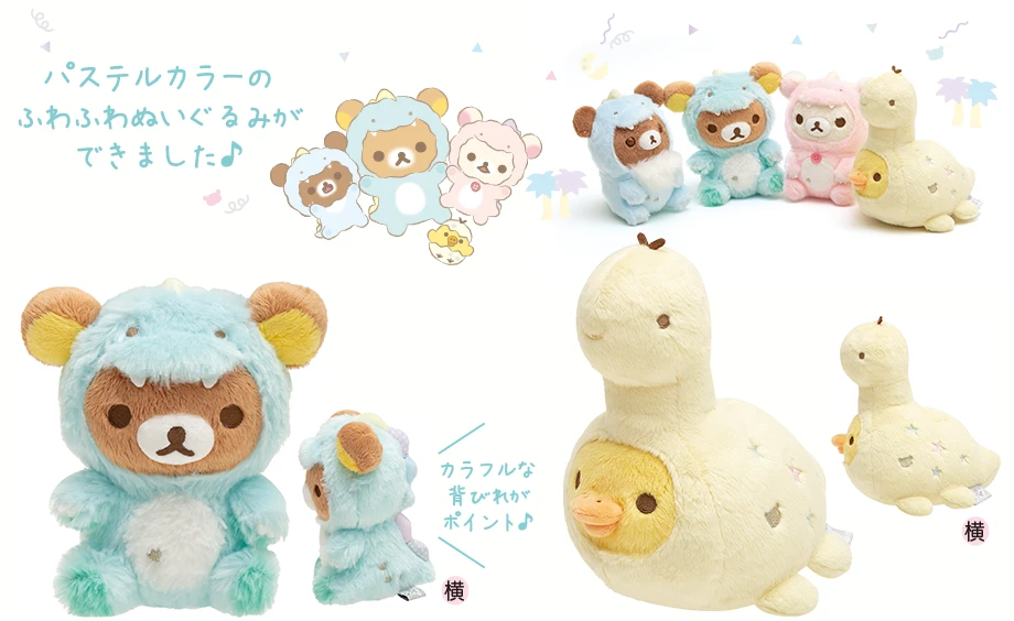 They look strong, but with pastel-colored designs full of cuteness! The plush toys look like they're wearing costumes and are super adorable! “Rilakkuma's Dinosaur Pretend Play” is now available!