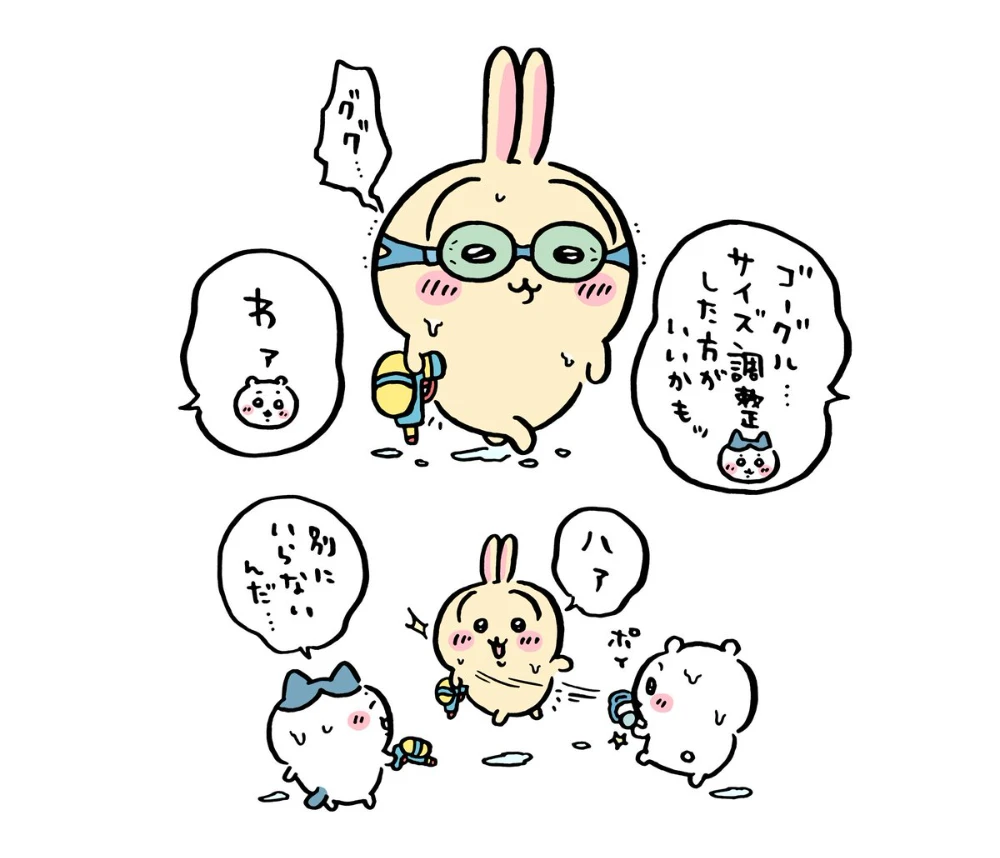The original illustration was posted about a year ago! Usagi is equipped with swim goggles and a water gun...... but the goggles don’t seem to fit quite right. When someone points it out, Usagi just tosses the goggles away without hesitation! That surreal illustration has now been turned into a plush!