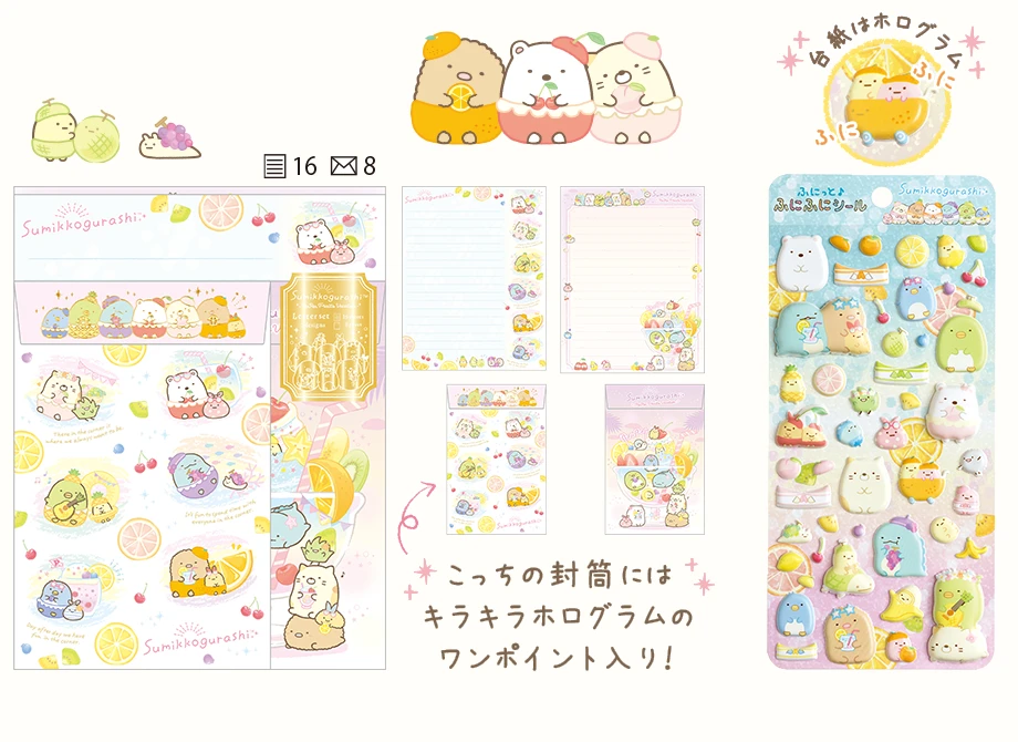 One day, Penguin (real) returned from a trip and invited everyone to go on vacation. And where did they go......? To the Penpen Pool!? Filled with delicious-looking fruits and juices, it overflowed with a vacation vibe. The Sumikko gang fully enjoyed a moment of holiday bliss.