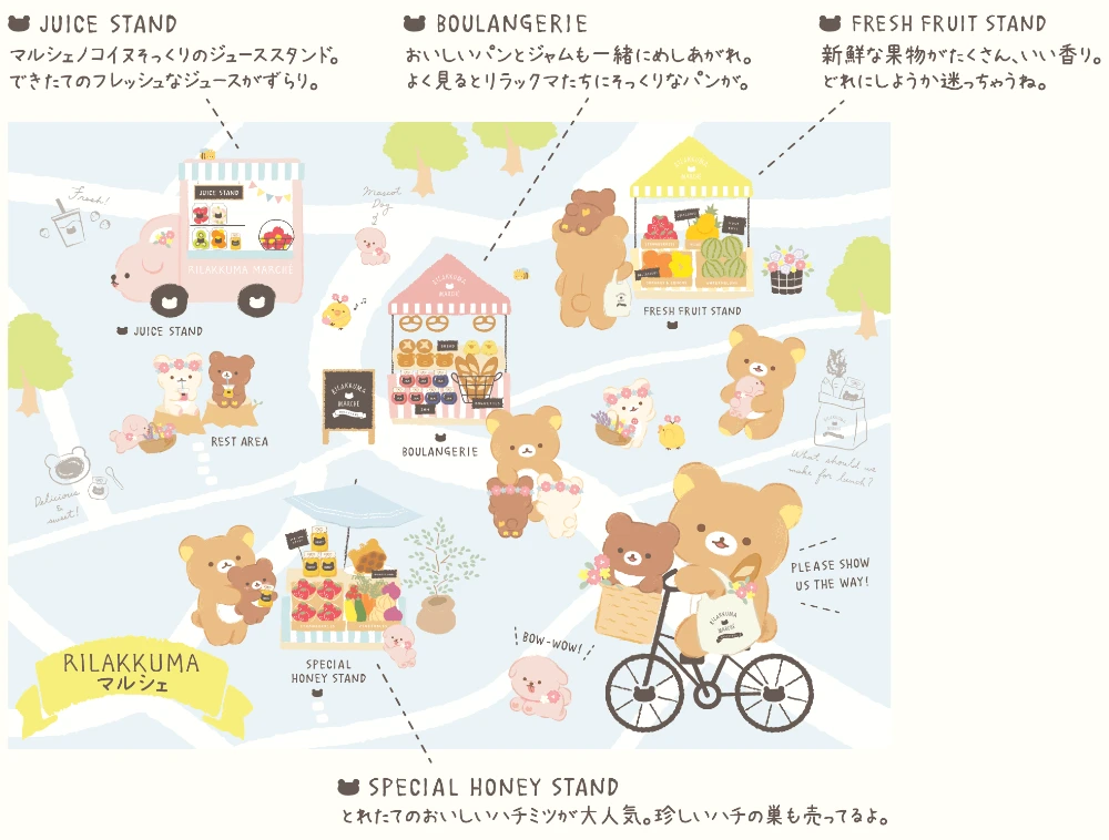 This goods theme actually even features a map showing what kind of shops are in what locations! By all means, when you go shopping at a marché or anywhere else, please check out this goods theme, the RILAKKUMA x Rilakkuma Marché goods!