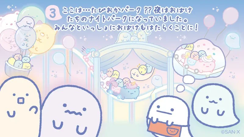 One night, ghosts led the familiar Sumikko characters to...... Ghosts’ Night Park!? Invited by the ghosts, the Sumikko gang nervously heads into the Night Park!