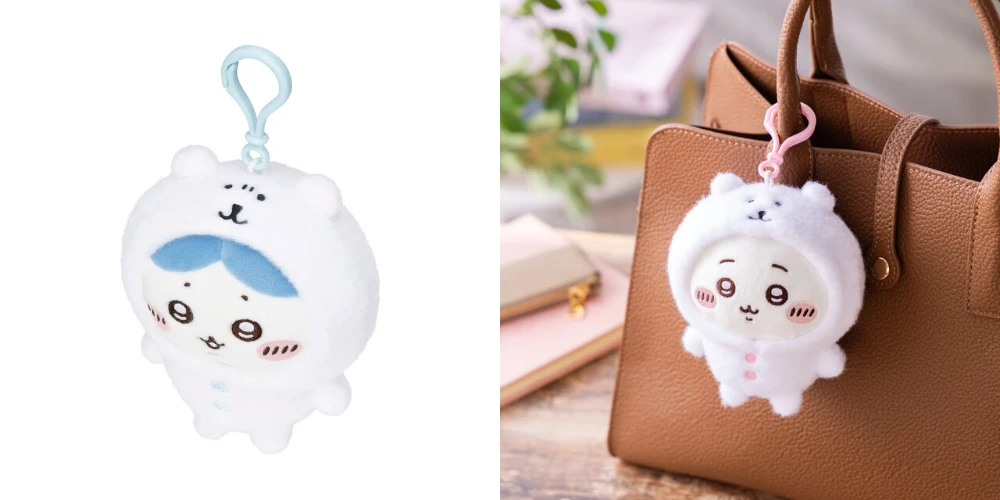Looking from above...... the bear on their head somehow looks familiar...... The hook part of the keychain type is made of plastic, making it easy and convenient to go out with them without scratching your bag! So by all means, everyone, please check out the plushie or keychain type of the Chiikawa × Wearing a Bear Series, according to your favorite type of merchandise!